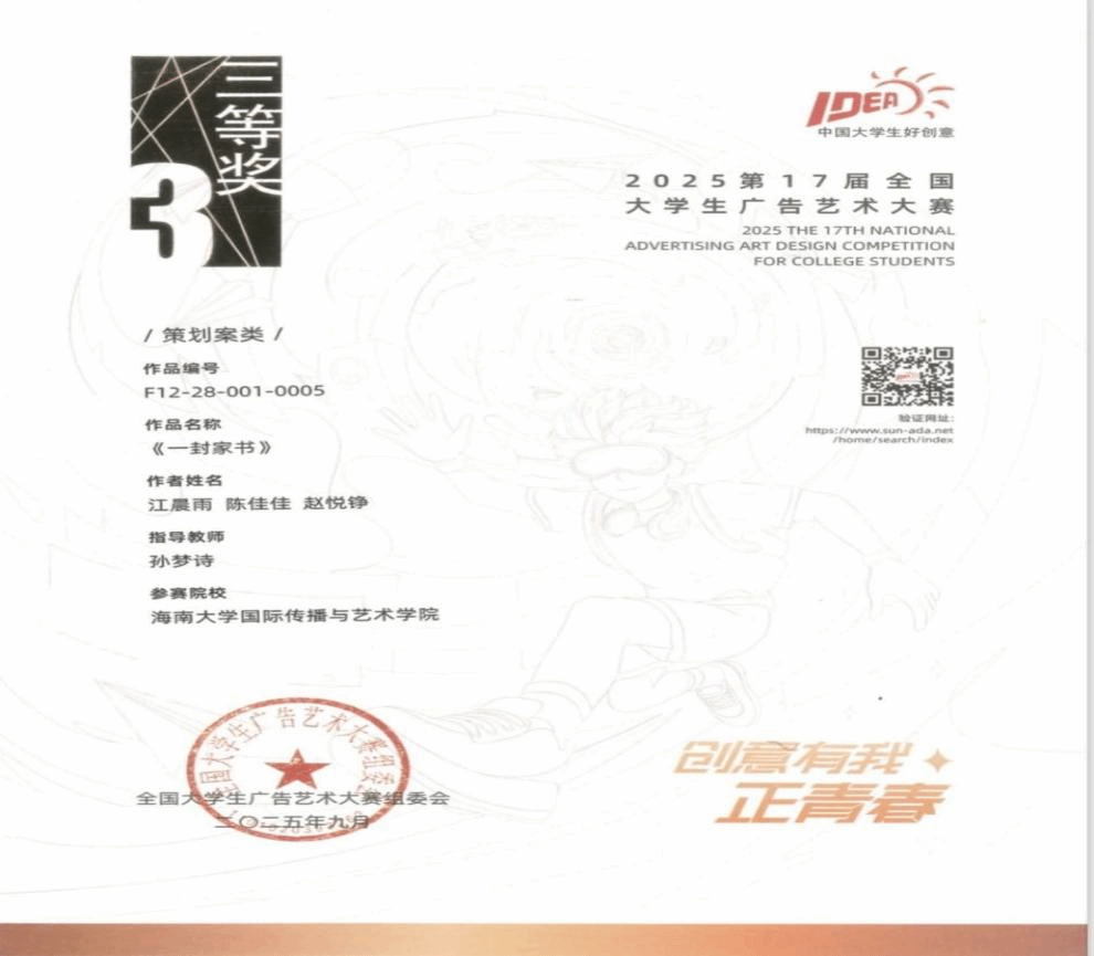 在本届大赛中,麻豆app师生团队积极备赛、踊跃参赛,凭借扎实的专业功底与蓬勃的创造力,历经层层选拔与激烈角逐,斩获佳绩。其中,全国级奖项收获三等奖2项、优秀奖5项;省级奖项斩获一等奖6项、二等奖24项、三等奖35项,充分彰显了麻豆app人才培养的扎实成效。同时,麻豆app教师在赛事组织与区域推动工作中表现突出,获全国组委会高度认可—麻豆app教师、大广赛海南赛区组委会秘书处孙梦诗,因卓越的组织协调能力被授予2025年度“优秀组织工作者”称号;麻豆app教师、大广赛海南赛区负责人何晶娇,因在推动海南赛区成立、助力大赛走进海南高校、搭建省内外学子创意交流平台等方面的突出贡献,荣获 “最佳推动奖”,海南赛区同步获评“优秀赛区”称号。