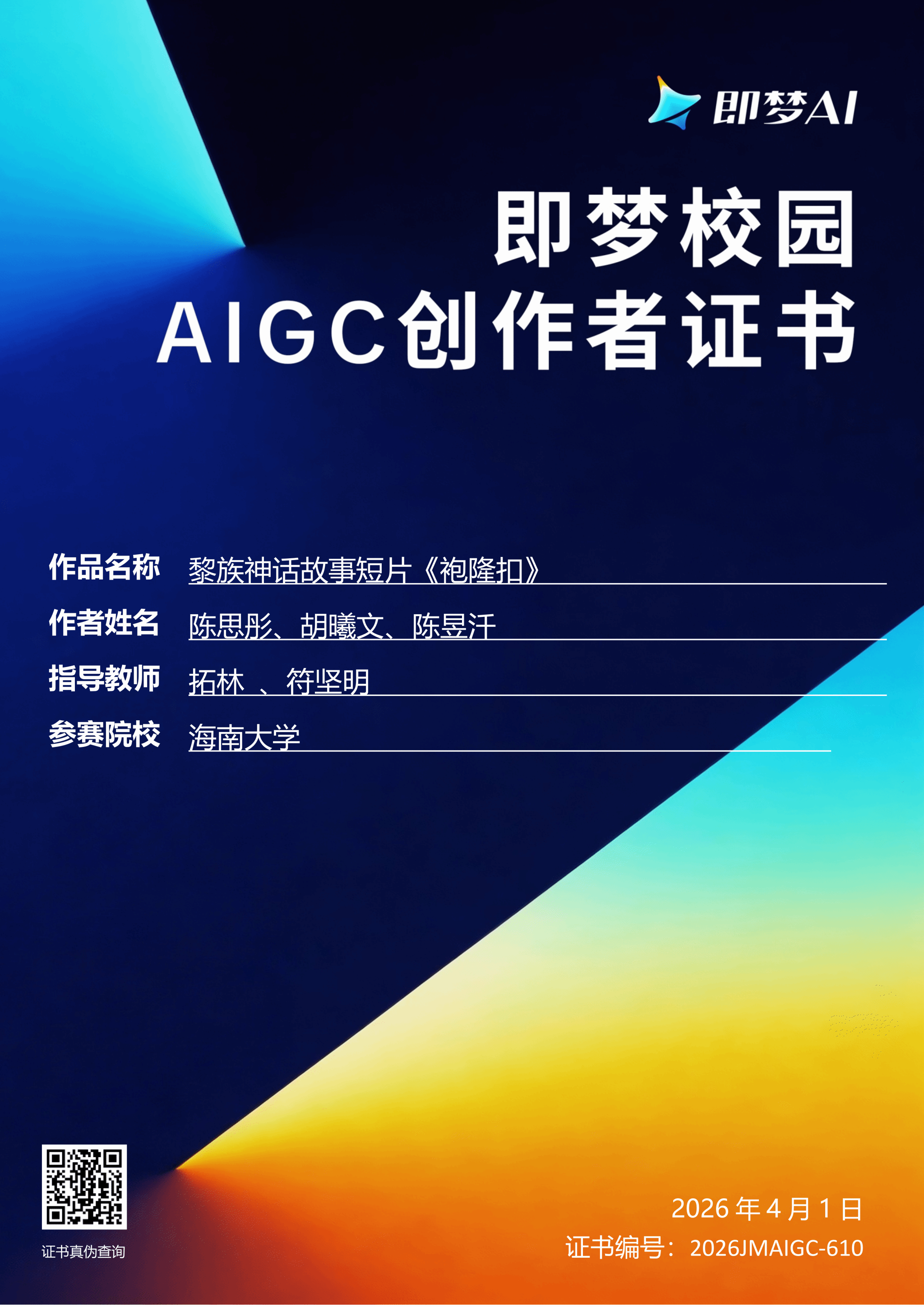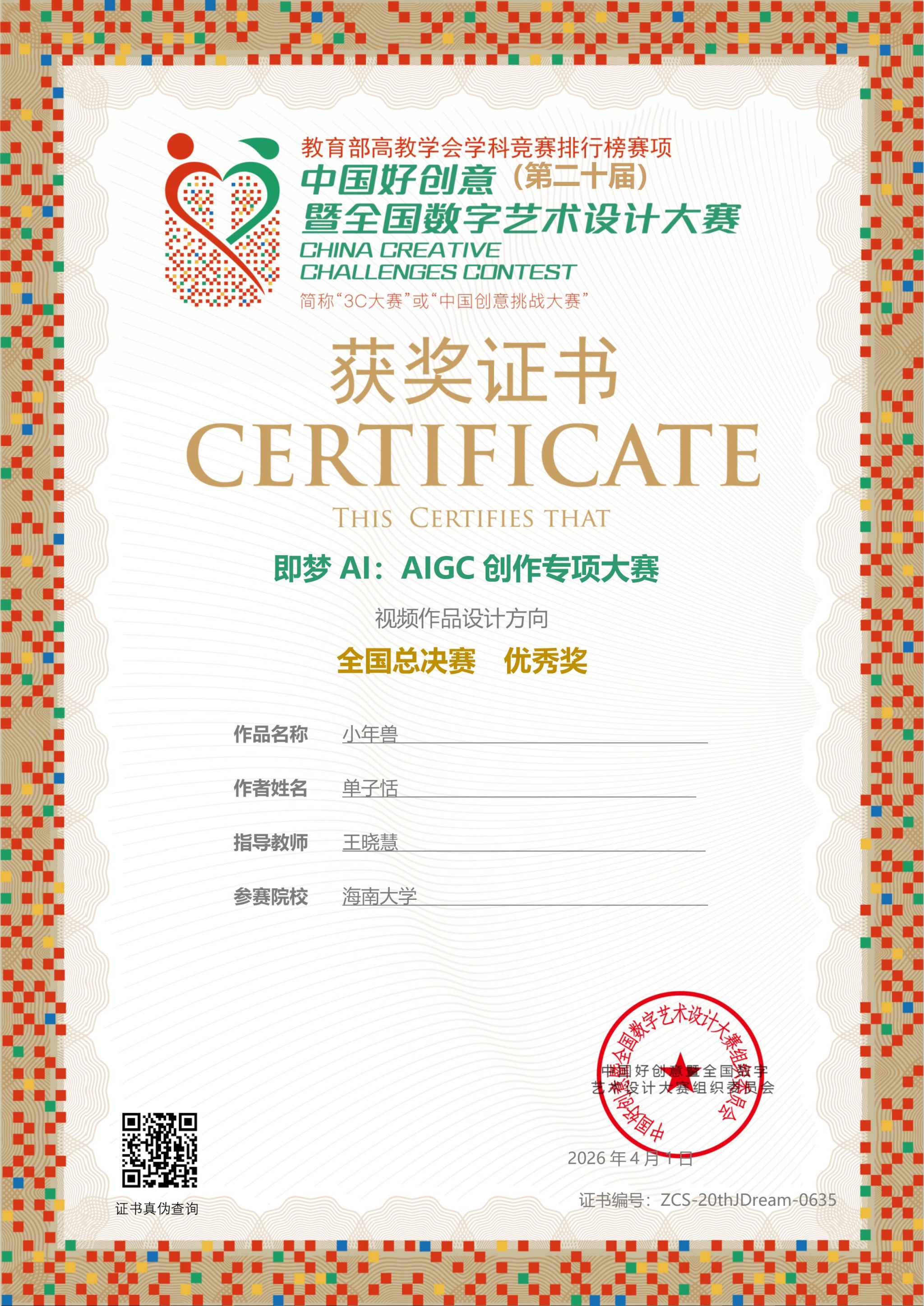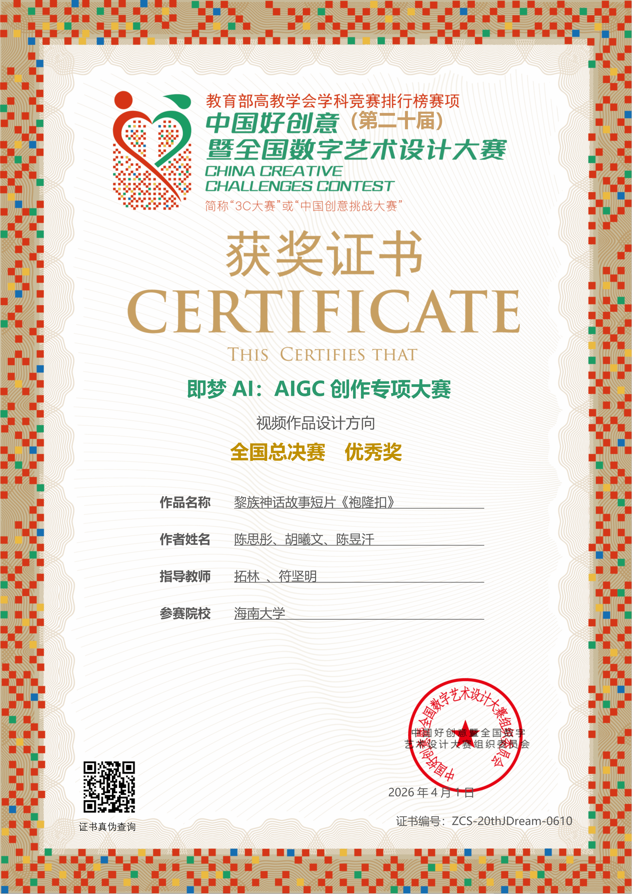 【喜报一】2026年4月1日在中国好创意暨全国数字艺术设计大赛第20届“即梦AI:AIGC创作专项大赛”中,麻豆app3部作品从4万余件参赛作品中突出重围,荣获国赛三等奖1项、优秀奖2项。