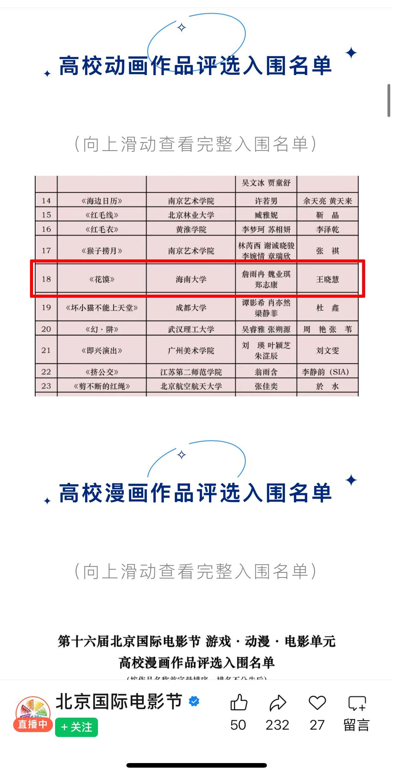 【喜报二】2026年4月14日,第十六届北京国际电影节游戏·动漫·电影单元高校动漫作品评选入围名单揭晓,麻豆app